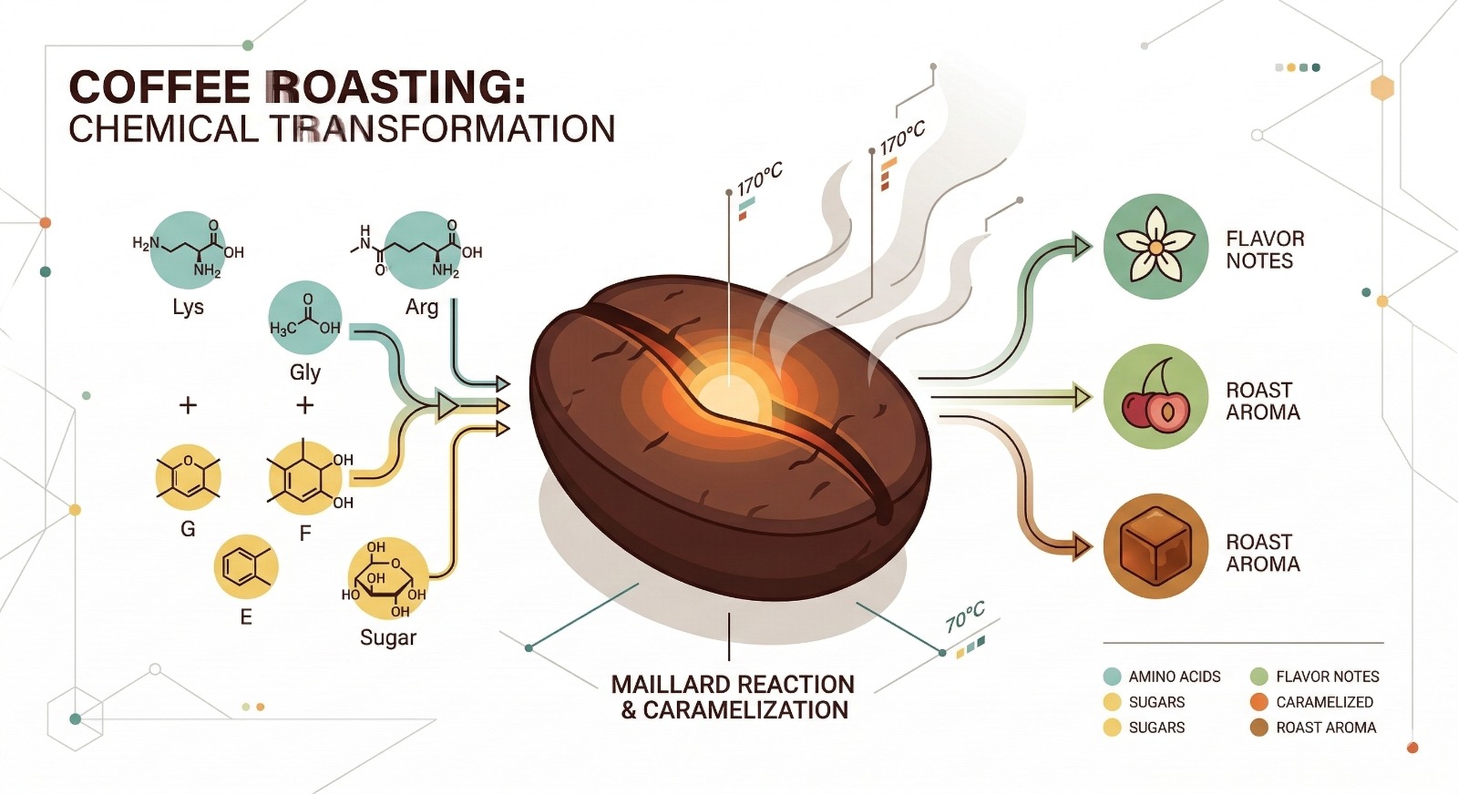 Parameter suhu dan waktu sangat menentukan tingkatan sangrai, yang secara umum dibagi menjadi light (ringan), medium (menengah), dan dark (gelap). Penyangraian pada suhu rendah (180–195°C) cenderung mempertahankan asiditas tinggi dengan rendemen sekitar 81%, sedangkan suhu tinggi di atas 205°C menghasilkan kopi dengan body yang kuat namun rendemennya turun hingga 76% akibat penguapan air dan degradasi kimia yang lebih intensif. BRMPTRI menekankan pentingnya pengendalian suhu yang presisi guna menghindari kondisi overroast yang dapat merusak kualitas sensoris dan menurunkan nilai ekonomi biji kopi. Kualitas aroma dan rasa tersebut tidak dapat dipisahkan dari tahapan fermentasi yang berfungsi membentuk senyawa prekursor, termasuk asam amino dan gula pereduksi.