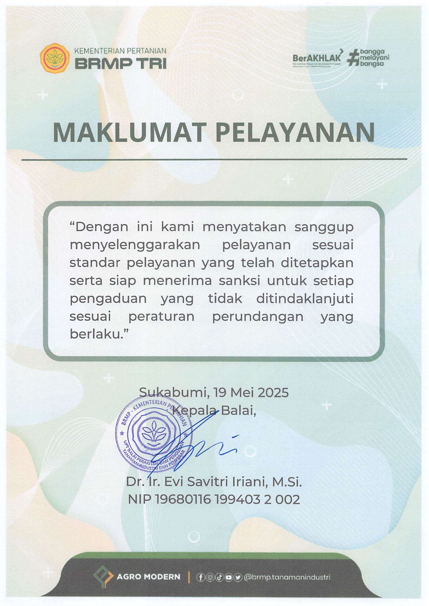 Sebagai badan publik, BRMP berkomitmen menyelenggarakan pelayanan sesuai standar dan peraturan perundang-undangan. BRMP memastikan setiap masyarakat dapat memperoleh layanan dengan mudah dan cepat. Komitmen ini tidak hanya menunjukkan dedikasi BRMP dalam melayani masyarakat, tetapi juga menjadi cerminan dari upaya untuk meningkatkan kualitas layanan publik di sektor pertanian.